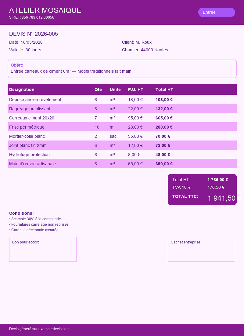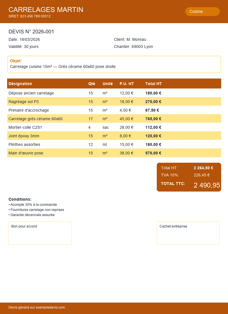 Découvrez des exemples de devis carrelage détaillés, simulez votre budget en ligne et téléchargez nos modèles gratuits au format PDF.