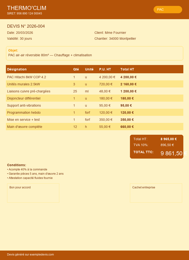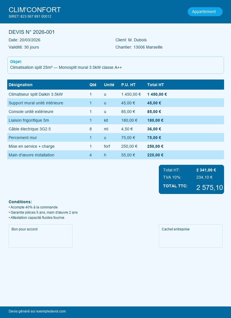 Découvrez des exemples de devis climatisation détaillés, simulez votre budget en ligne et téléchargez nos modèles gratuits au format PDF.