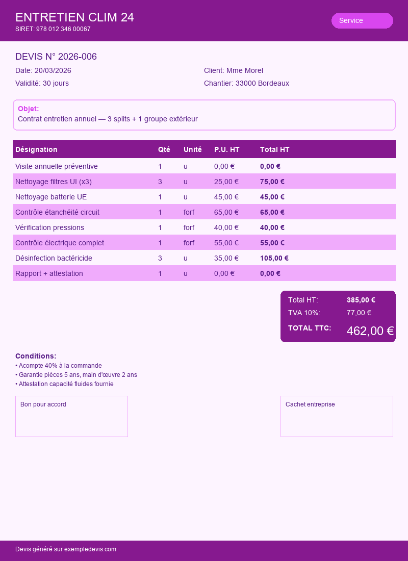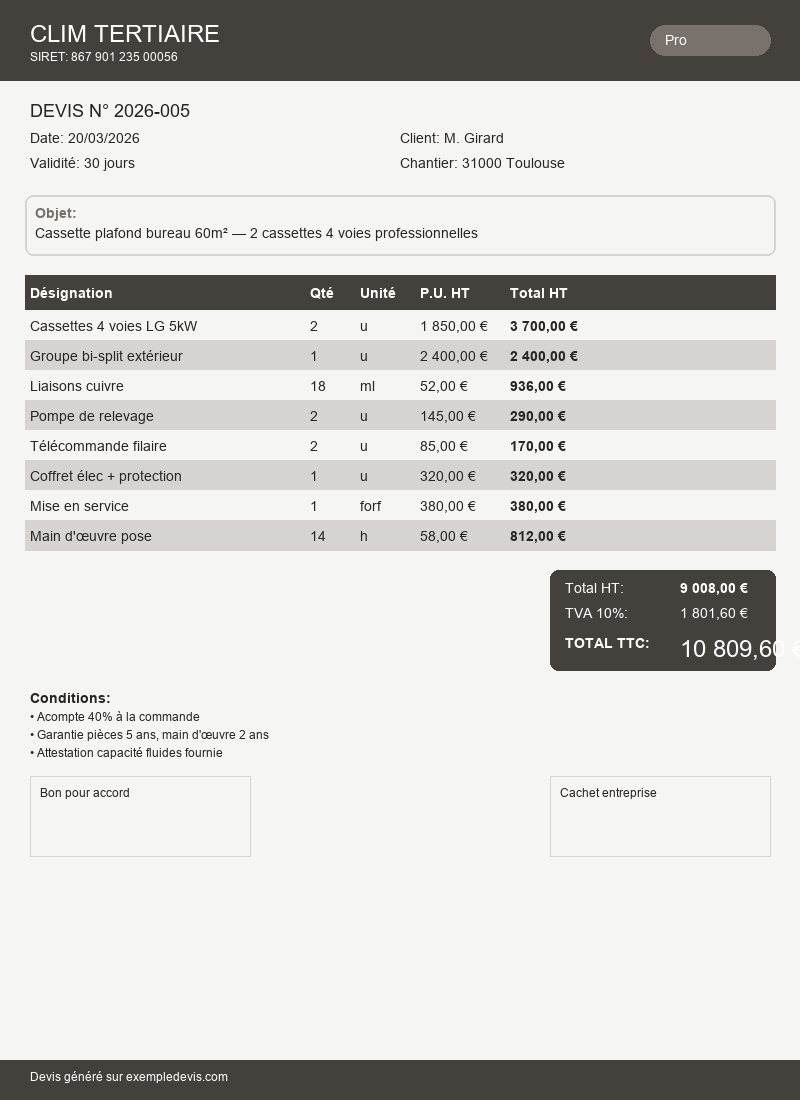 Refusez les devis “forfait global”. Chaque poste doit apparaître : préparation, puissance en kW, type de climatisation, prix par unité.