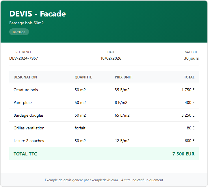 Découvrez des exemples de devis bardage détaillés, simulez votre budget en ligne et téléchargez nos modèles gratuits au format PDF.