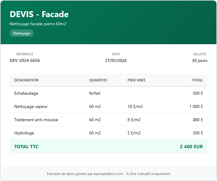 | Nettoyage facade | m² | 15 € | 25 € | 35 € | Haute pression, traitement |