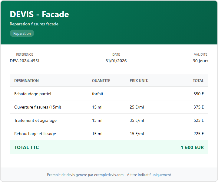| Réparation fissures | ml | 40 € | 70 € | 100 € | Ouverture, rebouchage, finition |