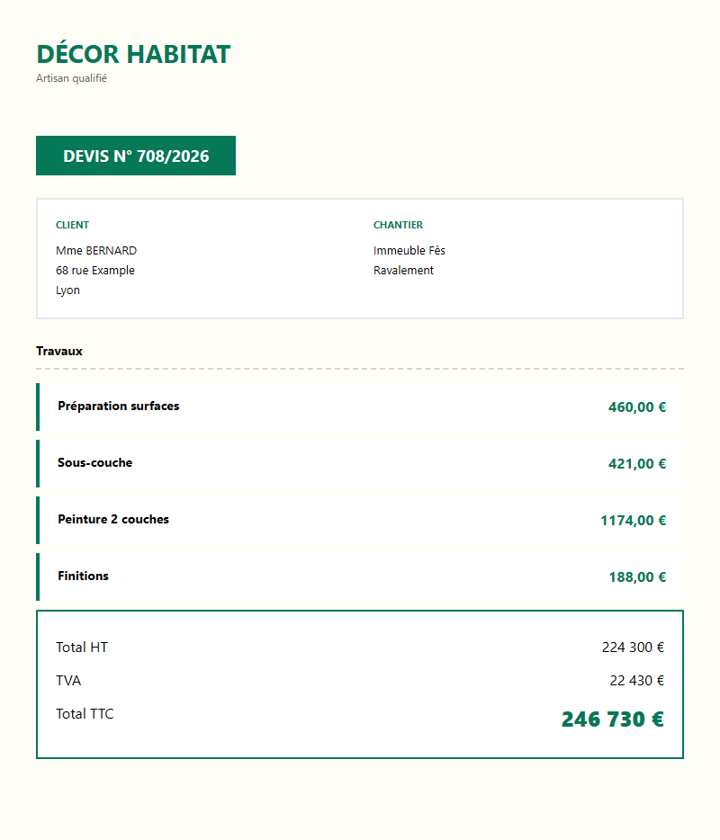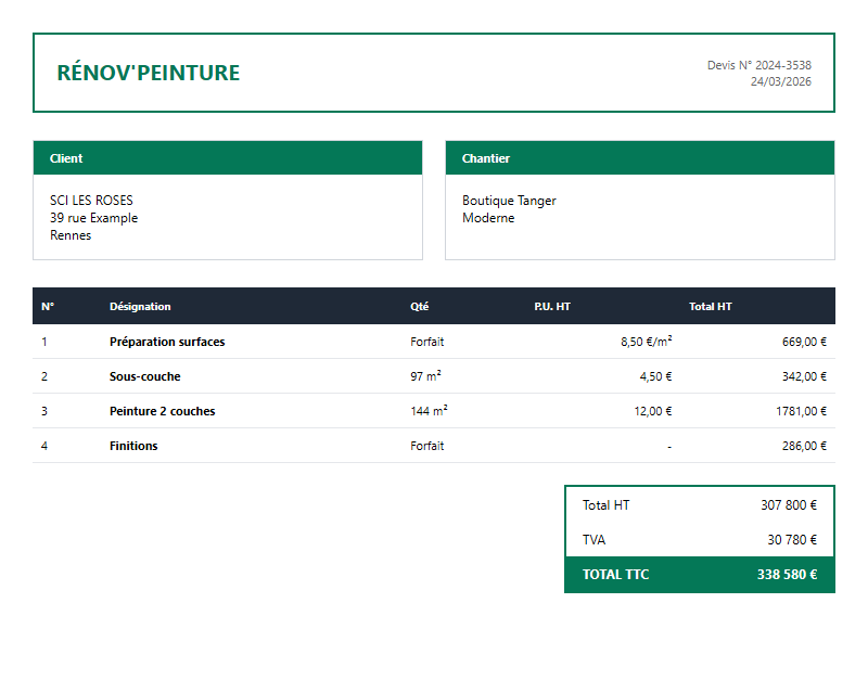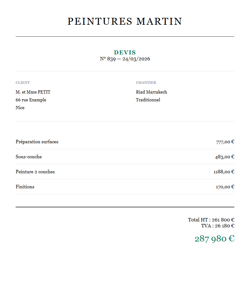 | Peinture vinylique murs | 300 m² | 15 000 DH |