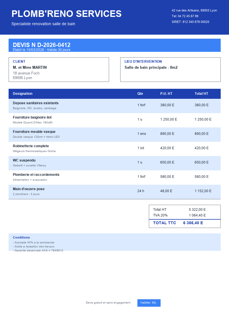 Modele de devis plomberie PDF avec prix detailles, mentions obligatoires et conseils pour bien chiffrer.